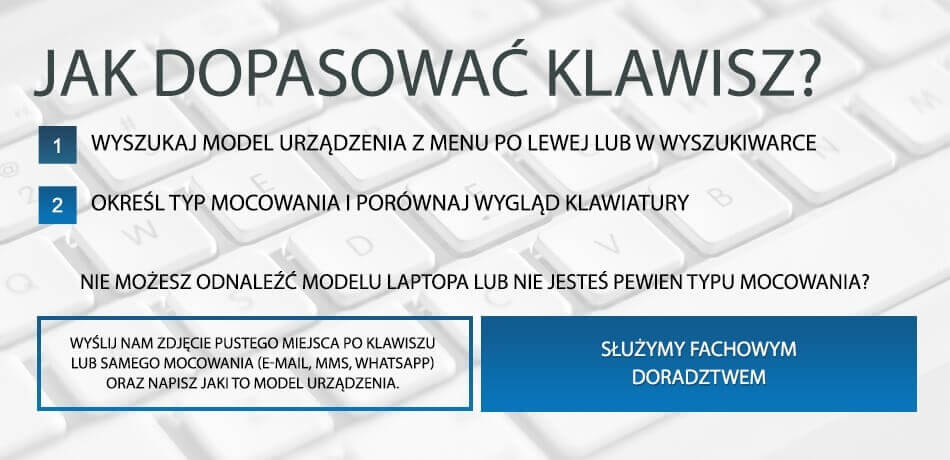 Twoja klawiatura: Acer (Aspire, Predator), Apple (MacBook), Asus, Dell (Vostro, XPS, Latitude), Lenovo (Legion, stary IBM), Gateway, HP, Medion, MSI (Raider), Samsung, Sony (Vaio), Toshiba (Tecra, Satellite), Logitech, Clevo, Fujitsu, Microsoft, Packard Bell, Panasonic, Razer czy też innego producenta uległa uszkodzeniu? Nie jesteś pewien, który klawisz do laptopa będzie pasować? Wahasz się, czy zaczep jest identyczny jak w Twoim urządzeniu? Nie wiesz, jak zdemontować uszkodzony klawisz wraz z mocowaniem? Zamówiłeś zapasowy klawisz, ale masz wątpliwości, jak go zamontować? Boisz się samodzielnie złożyć uszkodzone elementy? Chcesz wymienić połamany klawisz, ale nie odnajdujesz w naszym sklepie modelu swojego urządzenia? Skontaktuj się z nami – nasi wykwalifikowani i doświadczeni doradcy na pewno Ci pomogą (obsługa sklepu internetowego w 14 językach) w wyborze odpowiednich produktów oraz przekażą Ci pełne informacje na ich temat. Nasze porady są nieodpłatne, a dla osoby, która chce upewnić się, czy wybrała prawidłową klawiaturę lub rodzaj mocowania pod klawisz, są bardzo pomocne. Skontaktować się z nami można za pomocą formularza w zakładce KONTAKT, dzwoniąc pod numer telefonu, SMS/MMS, WhatsApp, Skype lub nasz Chat na stronie internetowej, możesz również skontaktować się z nami za pomocą naszego fanpage’a na FB. Pomocne będzie skompletowanie informacji: jaki model urządzenia posiadasz (np. Laptop Lenovo ThinkPad T420) oraz zdjęcie pustego miejsca po klawiszu z klawiatury. Dzięki takim informacjom bez problemu uda nam się dobrać potrzebne części zamienne.