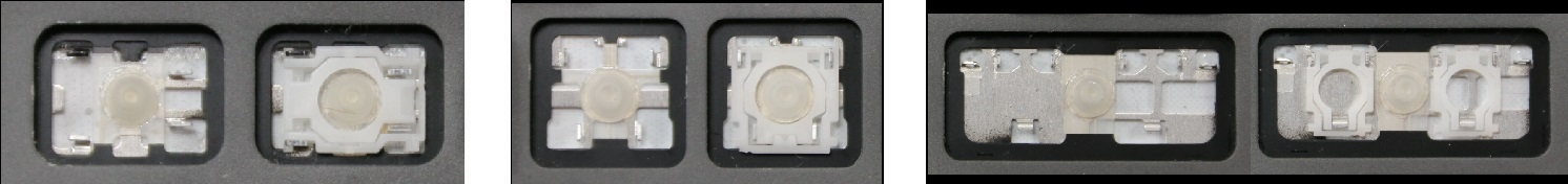 *Zdarza się, że w poszczególnych modelach klawiatury stosuje się więcej typów mocowań niż te trzy pokazane na zdjęciach; niektóre klawisze mają też metalowe zawiasy.