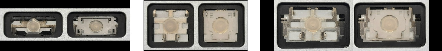 *Zdarza się, że w poszczególnych modelach klawiatury stosuje się więcej typów mocowań niż te trzy pokazane na zdjęciach; niektóre klawisze mają też metalowe zawiasy.