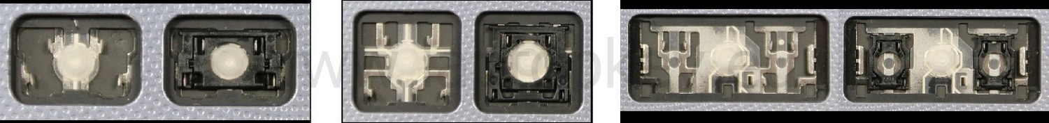 *Zdarza się, że w poszczególnych modelach klawiatury stosuje się więcej typów mocowań niż te trzy pokazane na zdjęciach; niektóre klawisze mają też metalowe zawiasy.