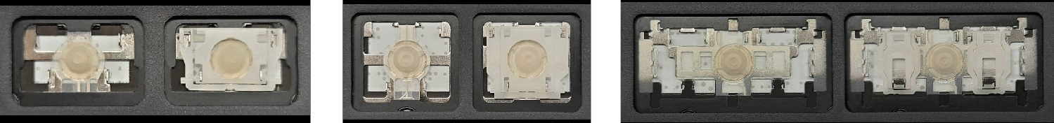 *Zdarza się, że w poszczególnych modelach klawiatury stosuje się więcej typów mocowań niż te trzy pokazane na zdjęciach; niektóre klawisze mają też metalowe zawiasy.