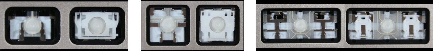 *Zdarza się, że w poszczególnych modelach klawiatury stosuje się więcej typów mocowań niż te trzy pokazane na zdjęciach; niektóre klawisze mają też metalowe zawiasy.