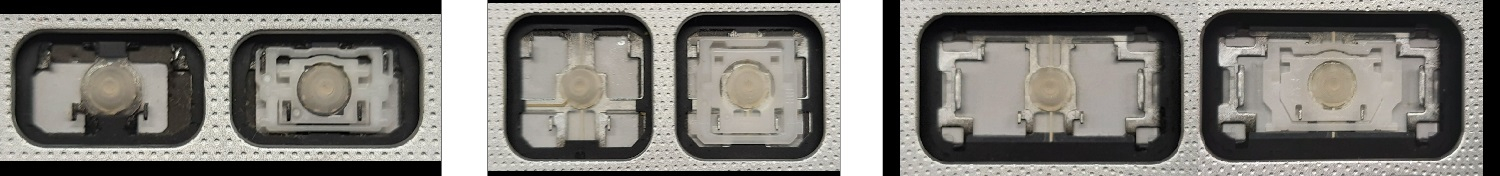 *Zdarza się, że w poszczególnych modelach klawiatury stosuje się więcej typów mocowań niż te trzy pokazane na zdjęciach; niektóre klawisze mają też metalowe zawiasy.