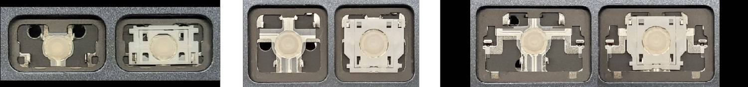 *Zdarza się, że w poszczególnych modelach klawiatury stosuje się więcej typów mocowań niż te trzy pokazane na zdjęciach; niektóre klawisze mają też metalowe zawiasy.