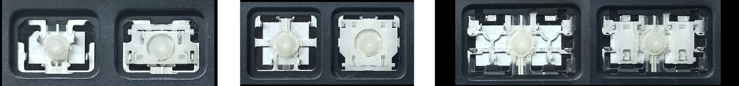 *Zdarza się, że w poszczególnych modelach klawiatury stosuje się więcej typów mocowań niż te trzy pokazane na zdjęciach; niektóre klawisze mają też metalowe zawiasy.