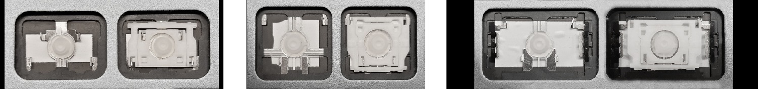 *Zdarza się, że w poszczególnych modelach klawiatury stosuje się więcej typów mocowań niż te trzy pokazane na zdjęciach; niektóre klawisze mają też metalowe zawiasy.