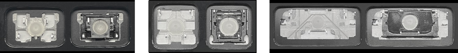 *Zdarza się, że w poszczególnych modelach klawiatury stosuje się więcej typów mocowań niż te trzy pokazane na zdjęciach; niektóre klawisze mają też metalowe zawiasy.