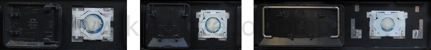 *Zdarza się, że w poszczególnych modelach klawiatury stosuje się więcej typów mocowań niż te trzy pokazane na zdjęciach; niektóre klawisze mają też metalowe zawiasy.
