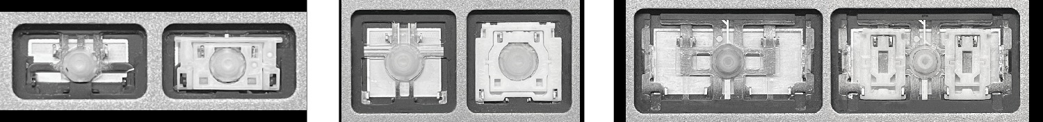 *Zdarza się, że w poszczególnych modelach klawiatury stosuje się więcej typów mocowań niż te trzy pokazane na zdjęciach; niektóre klawisze mają też metalowe zawiasy.
