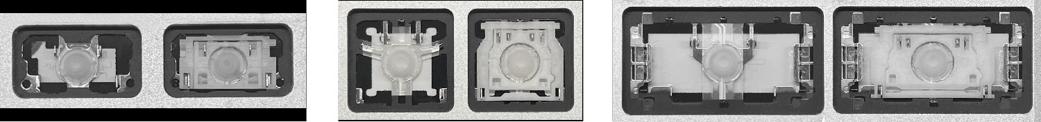 *Zdarza się, że w poszczególnych modelach klawiatury stosuje się więcej typów mocowań niż te trzy pokazane na zdjęciach; niektóre klawisze mają też metalowe zawiasy.