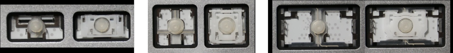 *Zdarza się, że w poszczególnych modelach klawiatury stosuje się więcej typów mocowań niż te trzy pokazane na zdjęciach; niektóre klawisze mają też metalowe zawiasy.