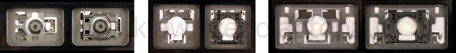 *Zdarza się, że w poszczególnych modelach klawiatury stosuje się więcej typów mocowań niż te trzy pokazane na zdjęciach; niektóre klawisze mają też metalowe zawiasy.