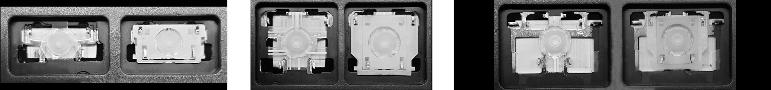*Zdarza się, że w poszczególnych modelach klawiatury stosuje się więcej typów mocowań niż te trzy pokazane na zdjęciach; niektóre klawisze mają też metalowe zawiasy.