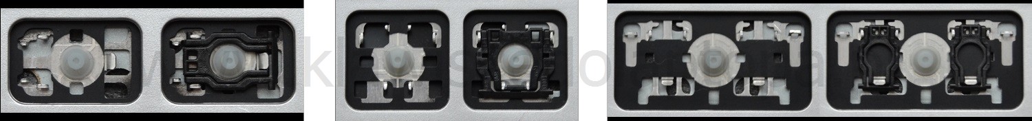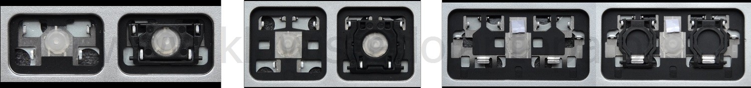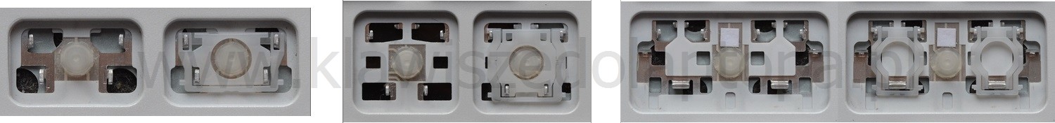 *Zdarza się, że w poszczególnych modelach klawiatury stosuje się więcej typów mocowań niż te trzy pokazane na zdjęciach; niektóre klawisze mają też metalowe zawiasy.
